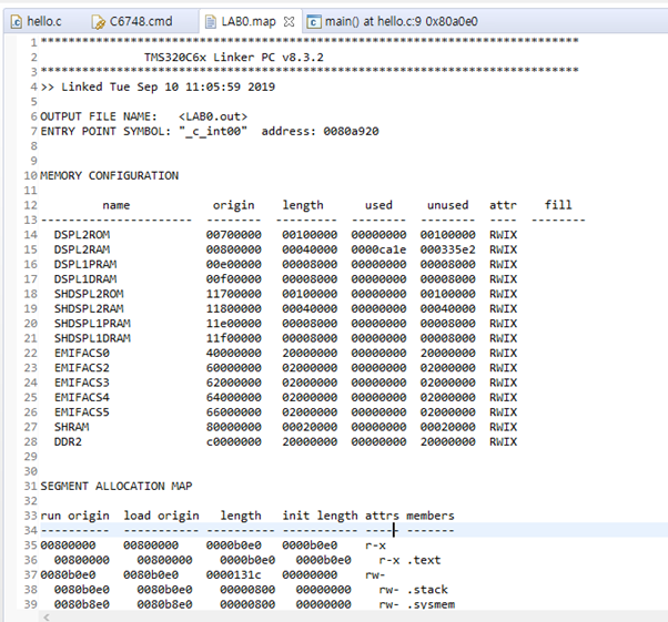 이 map 파일을 통해 메모리 시작번지와 크기를 볼 수 있다. Hello World 파일은 다 SHRAM에 들어간 것을 볼 수 있다. (만약 위의 .cmd파일을 변경하였다면 변경된 곳으로 들어갔을 것이다.)