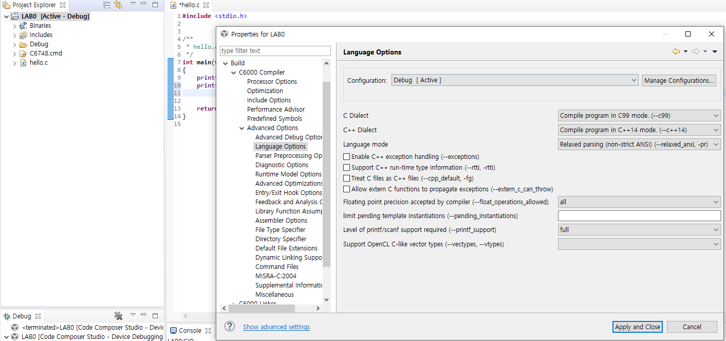프로젝트를 우클릭 한 뒤, Propertise -> Build -> C6000 Compiler -> Advanced Options -> Language Options 에 들어가 C Dialect를 C99 mode로 변환시켜놓자.