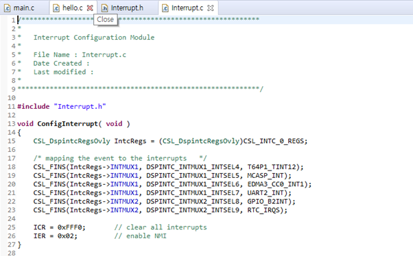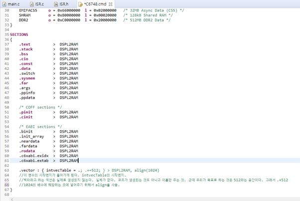 벡터테이블은 default가 0번지부터 인데 위치가 바뀌었다면 ISTP = (unsigned int)intvecTable; 이 줄을 통해서 벡터테이블의 위치를 찾는다. 만약 위치를 바꾸고 싶다면 ISTP를 이용해서 위치를 바꿀 수 있다. 인터럽트 벡터 테이블은 속도가 빠른 메모리에 넣어두는 것이 좋다. 그래서 전에 설명한 링크커맨드 파일에서 해당 벡터 테이블의 영역을 설정하였다.