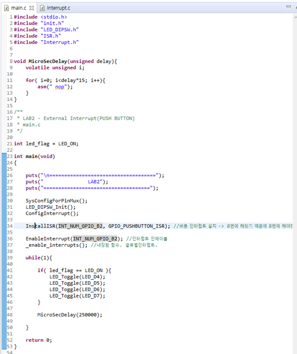 LAB1 에서는 계속해서 버튼이 눌렸는지를 검사하였다. 하지만 이 방식은 cpu의 리소스를 매우 많이 먹기 때문에 매우 안 좋은 방식이다. 따라서 인터럽트를 사용하는 방식을 통해 조금 더 향상된 프로그램을 만들어보자.