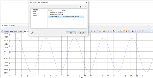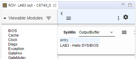 바로 System_printf()를 사용한 출력이다. 이 출력을 위해서는 #include <xdc/std.h>, #include <xdc/runtime/System.h>, #include <ti/sysbios/BIOS.h> 3줄이 필요하다. 아까 설명한 동작이 어떤 식으로 이루어지는지를 알아보기 위해 Runtime Object View를 이용해 보았다. 실행 과정에서 return 전 줄에 스탑을 걸어놓고(클릭을 하면 설정 가능하다) 아직 return이 되지 않은 상태에서 본 버퍼이다.
