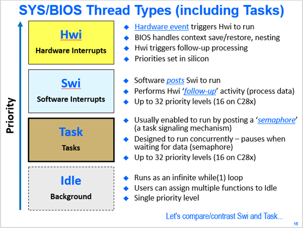우리는 SYS/BIOS라는 OS를 사용할 것이다. 이 OS는 TI에서 무료로 제공해준다. 보통 대부분의 real time OS는 매우 비싸다. 실시간 OS들은 한번 OS를 장착하면 OS자체를 변경을 잘 하지 않는다. 따라서 안정성이 매우 중요하며 이가 검증된 OS들은 높은 가격을 지닌다.