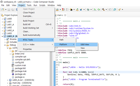해당 코드는 SYS/BIOS를 사용하지 않는다. 하지만 SYS/BIOS기반으로 작성하였기 때문에 빌드시간이 오래 걸린다. 그런데 여기서 한가지 의문을 품을 수 있다. LAB2에서는 C6748.cmd라는 파일을 통해 기기를 찾아 들어갔다. 지금은 어떻게 작동하는 것일까? 바로 프로젝트 생성 시 Platform 설정에서 ti.platforms.evm6748을 선택하여서 linker.cmd 파일이 자동 생성된 것이다. 이 파일을 커스텀마이징하기 위해 우리가 새로 만들어볼 필요가 있다.