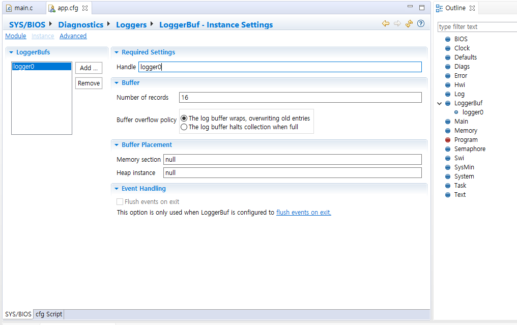 이를 위해서는 로그버퍼를 설정해줘야 한다. SYS/BIOS의 설정은 대부분 app.cfg 파일에서 이루어진다.