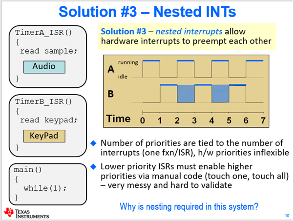 그런데 다음과 같은 상황이 발생했다고 생각해보자. 일반적인 인터럽트에 대해 (ti같은 경우) 하드웨어 인터럽트는 rest가 되지 않는다. 즉, 인터럽트에 들어가면 그 인터럽트가 끝나기 전에는 다른 인터럽트가 동작하지 않는다. 따라서 키패드가 동작하는 1ms 사이에 오디오 1um가 겹치면 오디오 인터럽트는 missed되는 것이다. Cpu의 퍼포먼스는 상대적으로 좋아 전체의 51%밖에 사용하지 못하는데 비해 처리 과정에서 제대로 실행되지 못하는 문제가 발생하게 된다.