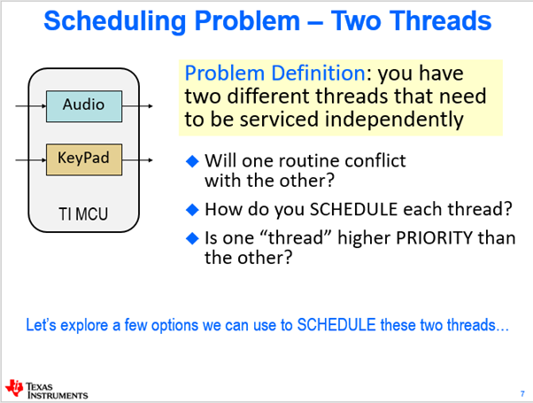 문제에 조건을 하나 추가해 보자. 오디오는 10us마다 계속 수행되어야 하고 키패드는 100ms의 주기로 체크해야 한다고 해보자. 처리해야 하는 두 task의 delay가 달라졌다. 어떻게 작동시키는 것이 가장 효과적일까?
