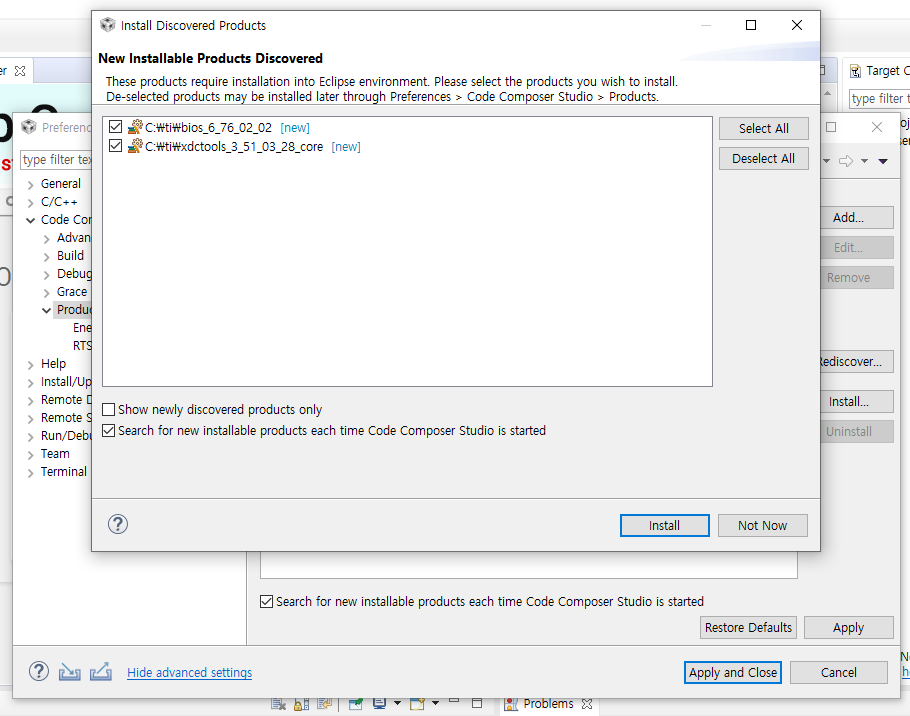 Window -> Preferences -> Code Composer Studio -> Products 클릭 Rediscover 클릭.