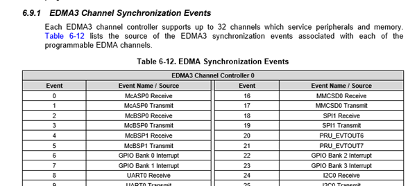TMS320C6748 Datasheet를 보면 여러 이벤트들의 넘버가 적혀있는 것을 볼 수 있다. 해당 데이터시트를 참고하면 McASP0 Receive가 이벤트 0번이고, Transmit는 1번임을 알 수 있다. 따라서 EDMA_McASP.h 파일에 다음과 같이 정의해놓은 것이다.