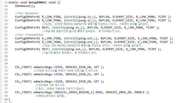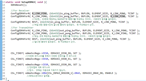 ConfigEDMAForR 함수는 EDMA명령서를 가지고 있는 함수이다. 이제는 익숙해져서 해당 명령서가 어떤 명령을 지니고 있는지 쉽게 파악할 수 있을 것이다. 인자로 지니고 있는 REVT는 자기자신에게 링크를 거는 역할을 한다. 이를 통해 명령 수행이 다 끝나면 자기의 명령서를 다시 복사해올 수 있다. TCINT는 명령 수행이 끝나고 나서 팬딩 레지스터를 체크하는 용도이다.