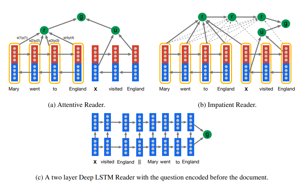 Attentive Reader와 Impatient Reader,그리고 Deep LSTM Reader이다. 3개에 대해 간략하게 설명하고 넘어가보자.